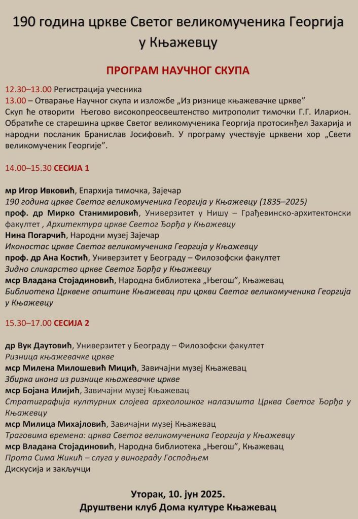 U organizaciji Crkvene opštine Knjaževac, Narodne biblioteka „Njegoš“ i Zavičajnog muzeja Knjaževac, a uz podršku Eparhije timočke i Opštine Knjaževac, u utorak, 10. juna, biće obeleženo 190 godina crkve Svetog velikomučenika Georgija u Knjaževcu.