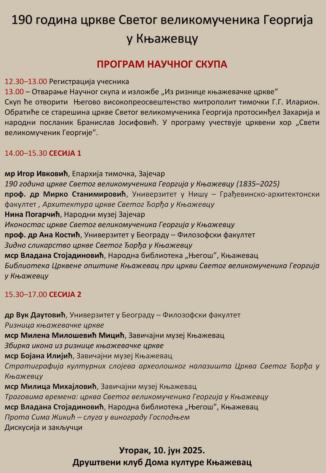 U organizaciji Crkvene opštine Knjaževac, Narodne biblioteka „Njegoš“ i Zavičajnog muzeja Knjaževac, a uz podršku Eparhije timočke i Opštine Knjaževac, u utorak, 10. juna, biće obeleženo 190 godina crkve Svetog velikomučenika Georgija u Knjaževcu.