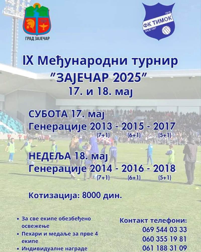 Međunarodni turnir u fudbalu „Zaječar 2025“, deveti po redu, biće organizovan u subotu i nedelju, 17. i 18. maja, na gradskom stadionu, na Kraljevici.