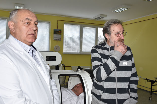 Edukativni razgovor sa pacijentom, ovaj put poznatim srpskim glumcem, oko korišćenja hiperbarične komore obavio je i direktor Specijalne bolnice za rehabilitaciju Dr Rade Kostić.