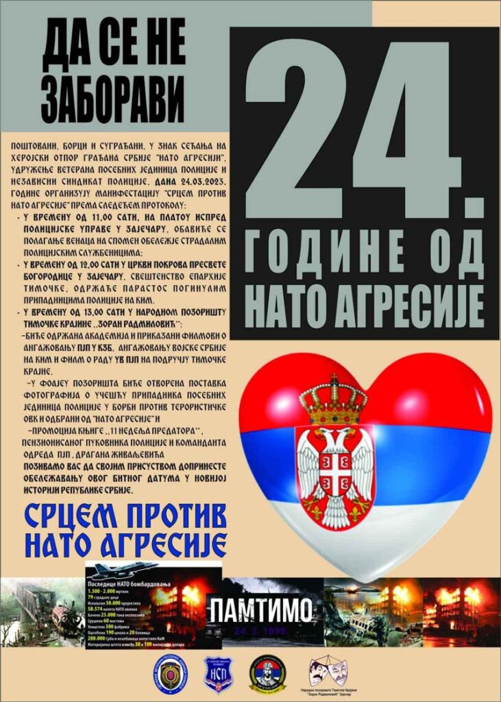 Tradicionalno, već treću godinu zaredom, u Zaječaru će manifestacijom „Srcem protiv NATO agresije” biti obeležen jedan od najtužnijih i najbolnijih datuma u novijoj istoriji srpskog naroda – 24 godine od početka NATO agresije.