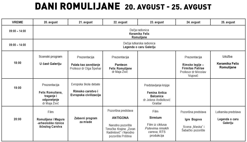 Program manifestacije obuhvata i prezentacije o arheologiji i istoriji Feliks Romulijane i Rimskog Carstva, koje će držati profesori sa Filozofskog fakulteta u Beogradu. Večernji termini biće posvećeni filmovima i predstavama.