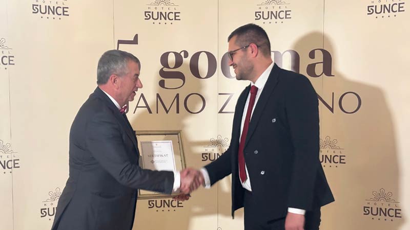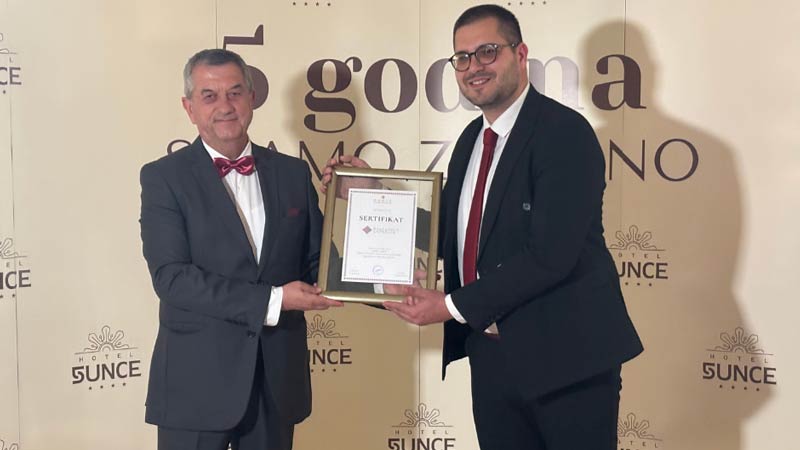 Nemanji Stojkoviću, direktoru operacija Hotela Sunce, sertifikat je uručio Vladan Jeremić, direktor RARIS-a – Regionalne agencije za razvoj istočne Srbije.