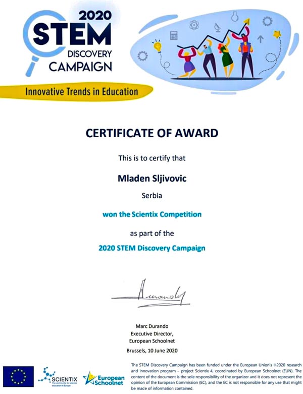 Nastavnik Šljivović je organizovao aktivnost koja je povezala video-igre i simulaciju eksperimenata iz nuklearne fizike. Ona je izabrana kao jedna od 23 najbolje aktivnosti u Evropi od strane projekta Scientix i organizacije European SchoolNet. Kao i svake godine European SchoolNet je i ove organizivao Nedelju otkrivanja STEM-a (nauka, tehnologija, inženjerstvo i matematika). Organizatori su zbog epidemije odlučili da temu takmičenja promene i uključe onlajn aktivnosti.