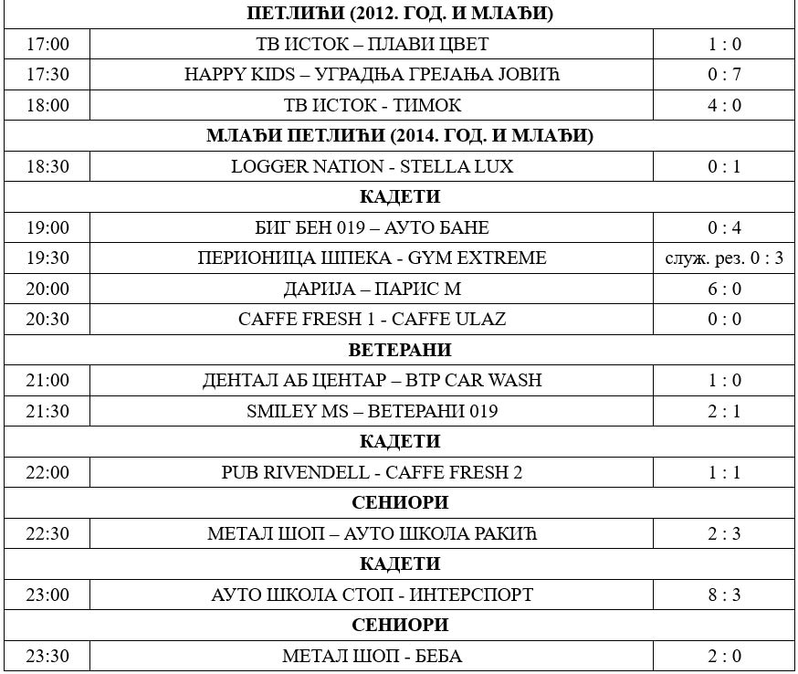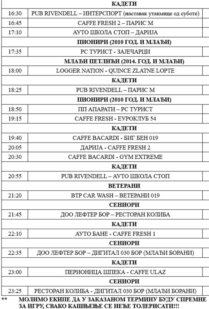 Najmasovniji turnir u malom fudbalu nastavlja se večeras, utakmicama kadeta, pionira (2010. godište i mlađi), mlađih petlića (2014. godište i mlađi), veterana i seniora.