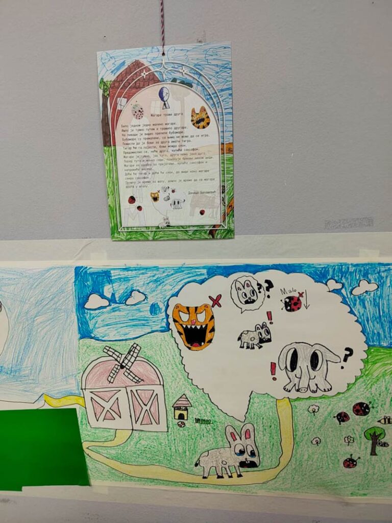 Radionice su pored umetničkog izražavanja bile i prostor razigranosti, mašte i istraživanja, a deca su sa iskrenim oduševljenjem prihvatila izazov da svoje emocije, misli i utiske prenesu na zidove. I upravo u toj neposrednosti stvaranja leži snaga ove izložbe, u trenutku kada se crtež i stih susretnu, kada dečja ruka povuče liniju inspirisanu poezijom, a zid umesto barijere postane nosilac poruke.