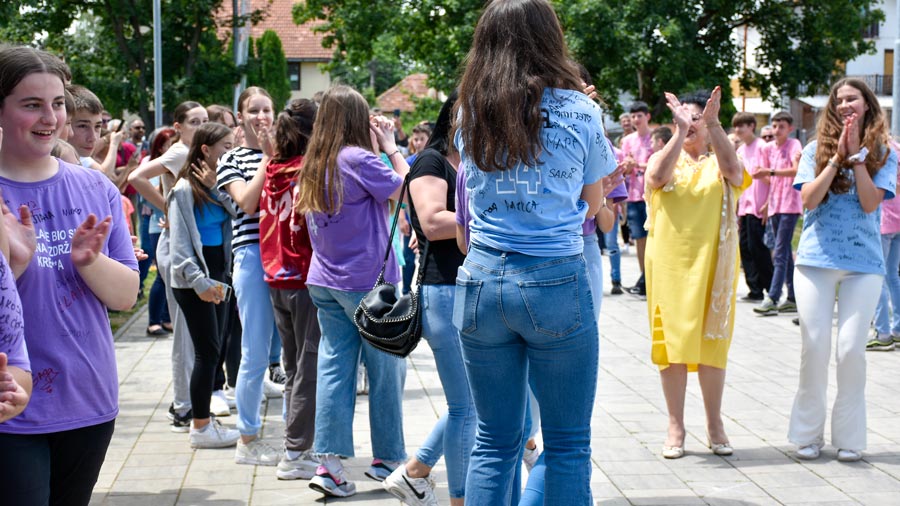 U dvorištu ove škole danas je plesalo 89 osmaka, a kada se zaigralo kolo pridružili su se i nastavnici, roditelji, drugari, nakon čega je usledilo i nezaobilazno fotografisanje, da se sačuvaju uspomene – na lepe i važne trenutke.