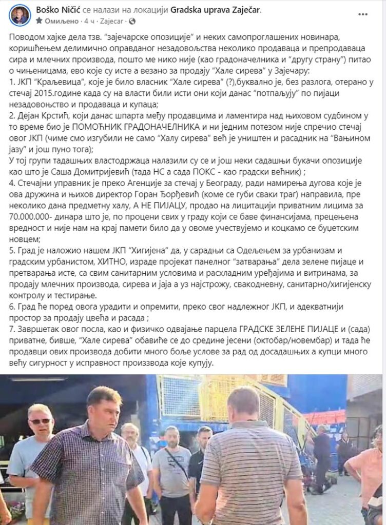 Ovim povodom oglasio se i gradonačelnik Zaječara Boško Ničić, koji podseća da je Hala sireva u Zaječaru bila u vlasništvu JKP “Kraljevica”, koje je, kako navodi, bukvalno, bez razloga, oterano u stečaj 2015. godine kada su, dodaje, „na vlasti bili isti oni koji danas “potpaljuju” po pijaci nezadovoljstvo i prodavaca i kupaca“.