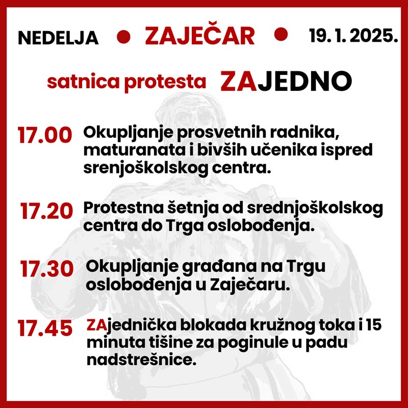 Protest „ZAjedno” najavljen je za nedelju, 19. januar, kada će se, kako se navodi u saopštenju, prosvetni radnici, maturanti i bivši učenici srednjih i osnovnih škola u Zaječaru, okupiti u 17 časova u srednjoškolskom centru. Odatle će, kažu, krenuti u protestnu šetnju do Trga oslobođenja, gde je okupljanje najavljeno za 17.30, dok će od 17.45 biti blokiran kružni tok na 15 minuta, kako bi se u tišini odala pošta nastradalima u padu nadstrešnice.