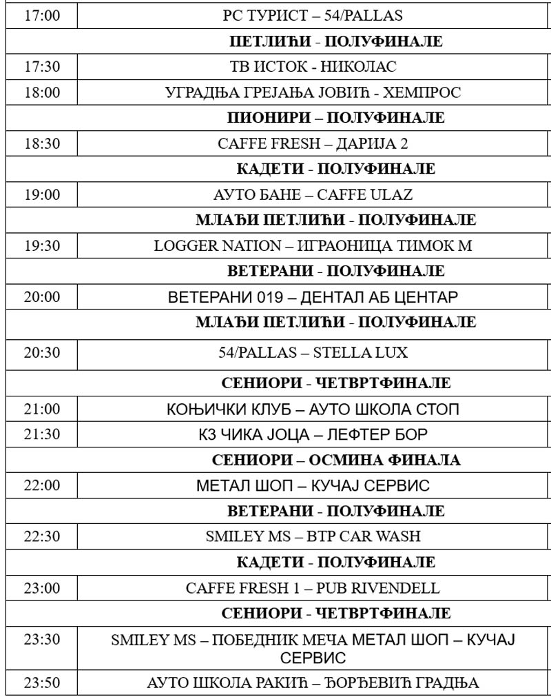 Večeras je pretposlednji dan turnira kada će biti odigrane polufinalne utakmice u svim kategorijama, osim u kategoriji seniora gde će biti odigran jedan meč osmine finala i četvrtfinale. U subotu je, kako kažu organizatori dan za odmor.