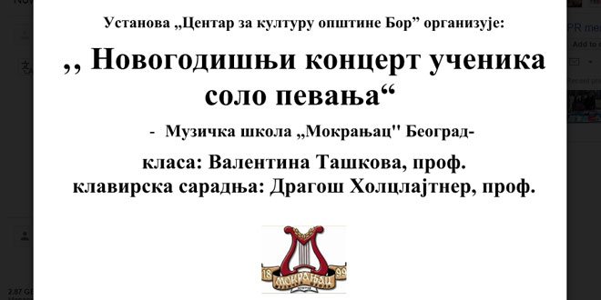 Ustanova ,,Centar za kulturu opštine Bor” 23. decembra organizuje „Novogodišnji koncert učenika solo pevanja“ , u izvođenju Muzičke  škole  ,,Mokranjac“ Beograd, u klasi prof.  Valentine  Taškove  i u  klavirskoj saradnji prof. Dragoša Holclajtnera.