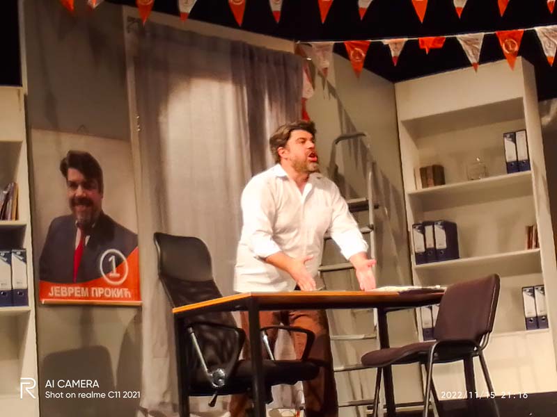 U predstavi igraju: Jevrem Prokić – Fuad Tabučić, Pavka – Nataša Petrović, Danica – Ivana Bartunjek, Sreta – Miloš Tanasković, Spira – Predrag Grbić, Spirinica – Ana Bretšnajde, Ivković – Branislav Mijatović, Mladena – Viktorija Arsić, Jovica Jerković – Gabrijel Bećarević, Sekulićka – Aleksandra Manasijević, Govornik iz naroda – Marija Stanković, narod – Maria Ristić i Stevan Đorđević.