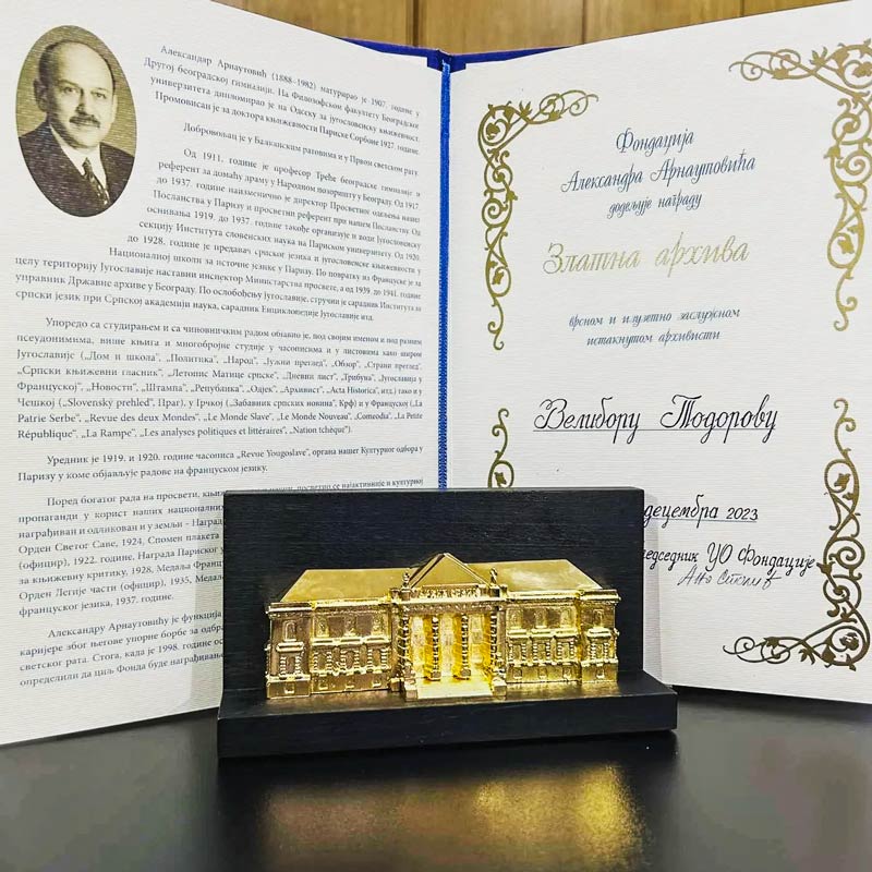 Komisija za dodelu dveju ravnopravnih nagrada „Zlatna arhiva“ Fondacije Aleksandra Arnautovića u sastavu: predsednica Komisije Nada Petrović i članovi dr Ljubodrag P. Ristić i Aleksandar Marković, na sednici od 6. novembra ove godine, donela je odluku da se nagrada „Zlatna arhiva“ za 2023. godinu dodeli dr Jasmini Nikolić, direktorki Istorijskog arhiva Požarevac i Veliboru Todorovu, direktoru Istorijskog arhiva „Timočka krajina“ u Zaječaru. Nagrada se dodeljuje za izuzetna dostignuća u oblasti arhivistike.