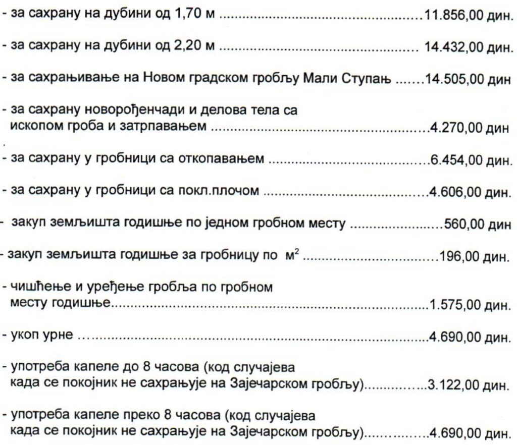 Pored saglasnosti JKSP „Zaječar“ za povećanje cena grejanja i izvoženja smeća, gradski parlament danas je odobrio i nove cene grobljanskih uslug, koje će se primenjivati od 1. januara naredne godine.