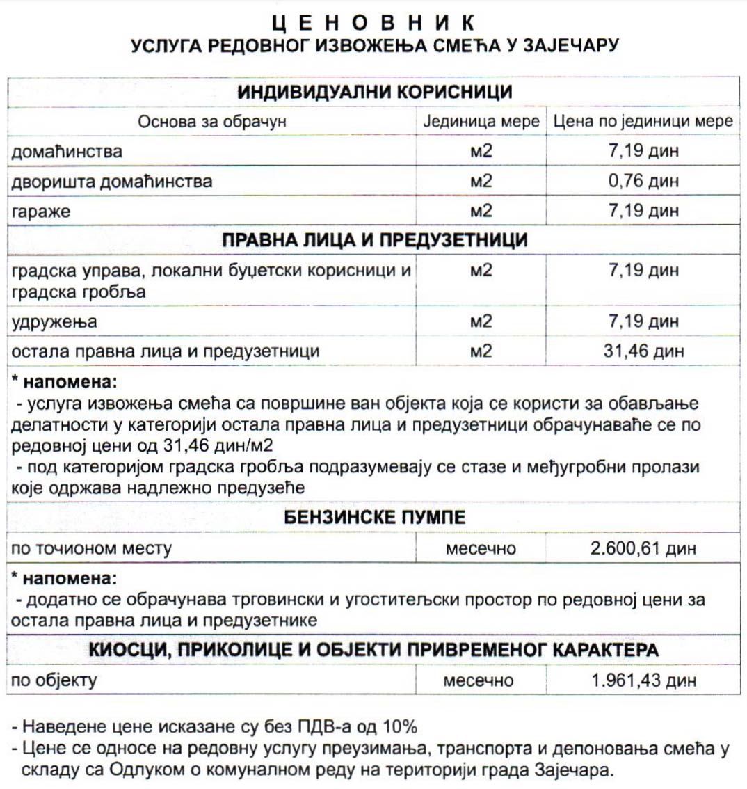 Skupština grada Zaječara odobrila je danas nove cene grejanja, izvoženja smeća i grobljanskih usluga. Nova cena grejanja za domaćinstva iznosi 150,72 dinara po metru kvadratnom, dok je cena grejanja za poslovni prostor 188,40 dinara po metru kvadratnom. Za izvoženje smeća izvršena je korekcija cena u visini od 31,65 odsto, dok su cene grobljanskih usluga uvećane za 38,6 do 40 odsto.