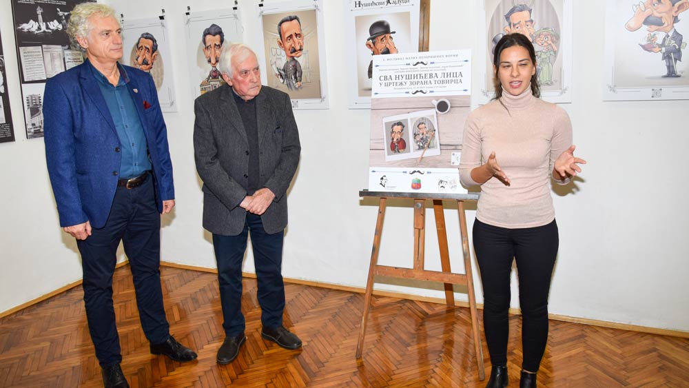 Izložbu je otvorio Nebojša Nušić, potomak čuvenog srpskog komediografa i upravnik „Nušić“ fondacije koji je objasnio da osam izloženih karikatura prikazuje isto toliko oblasti Nušićevog života i rada: Nušić kao dramski pisac, Nušić i kompozitori, Nušić kao novinar, Nušić i deca, Nušić kao fotograf, diplomata, inicijator osnivanja Paviljona Cvijete Zuzorić i kao retoričar.