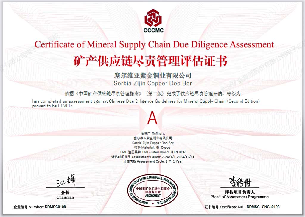 Kineska privredna komora za uvoznike i izvoznike metala, minerala i hemikalija (CCCMC), jedna od tri revizorske kuće koje Londonska berza metala priznaje kao kompetentne u oblasti lanca snabdevanja bakrom, ocenila je sve procese koji su uključeni u nabavku sirovina za proizvodnjukatodnog bakra u Boru. Srbija Ziđin Koper dobila je ocenu A za poreklo sirovina, proizvodnju, logistiku i transport, distribuciju i korisnički servis, odnosno za sve ono što obuhvata lanac snabdevanja bakrom.