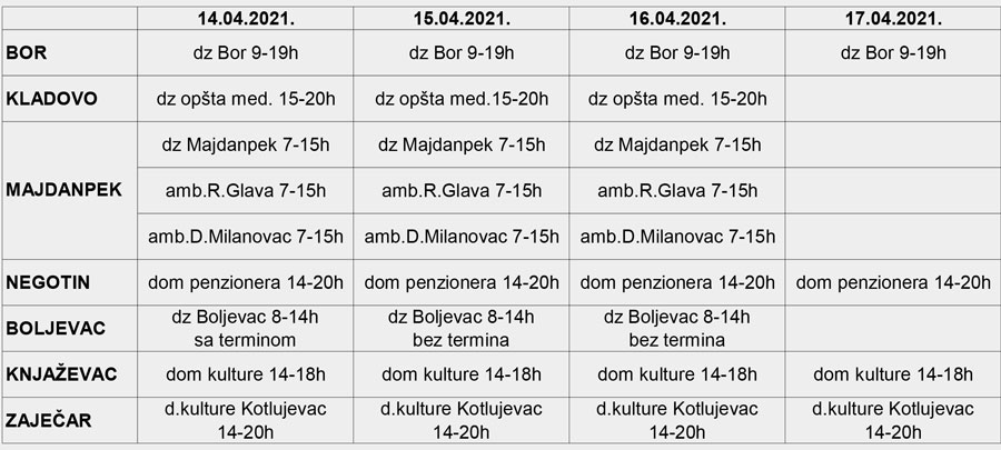 Na punktovima u nadležnosti ZZJZ „Timok“ Zaječar, 14, 15, 16. i 17. aprila vakcinacija protiv Kovida 19, bez prethodnog zakazivanja, obavljaće se po sledećem rasporedu: