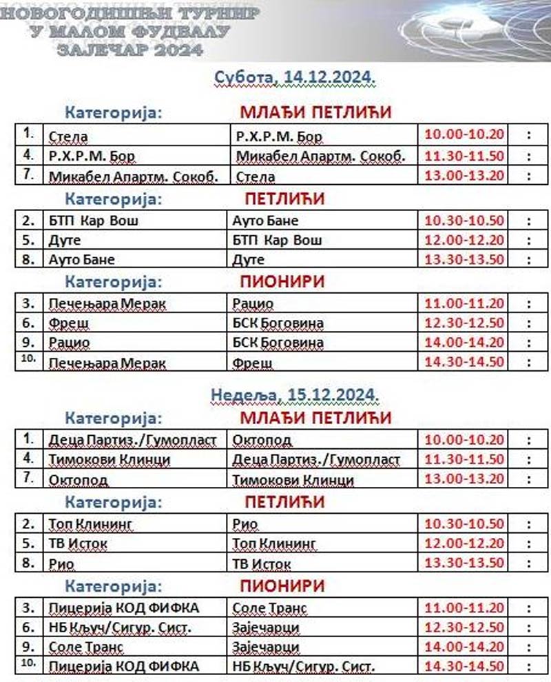 Nakon obavljenog žreba, tokom vikenda, u subotu 14. i nedelju 15. decembra, u okviru Novogodišnjeg turnira „Zaječar 2024“ biće odigrano 20 utakmica ekipa mlađih uzrasnih kategorija.
