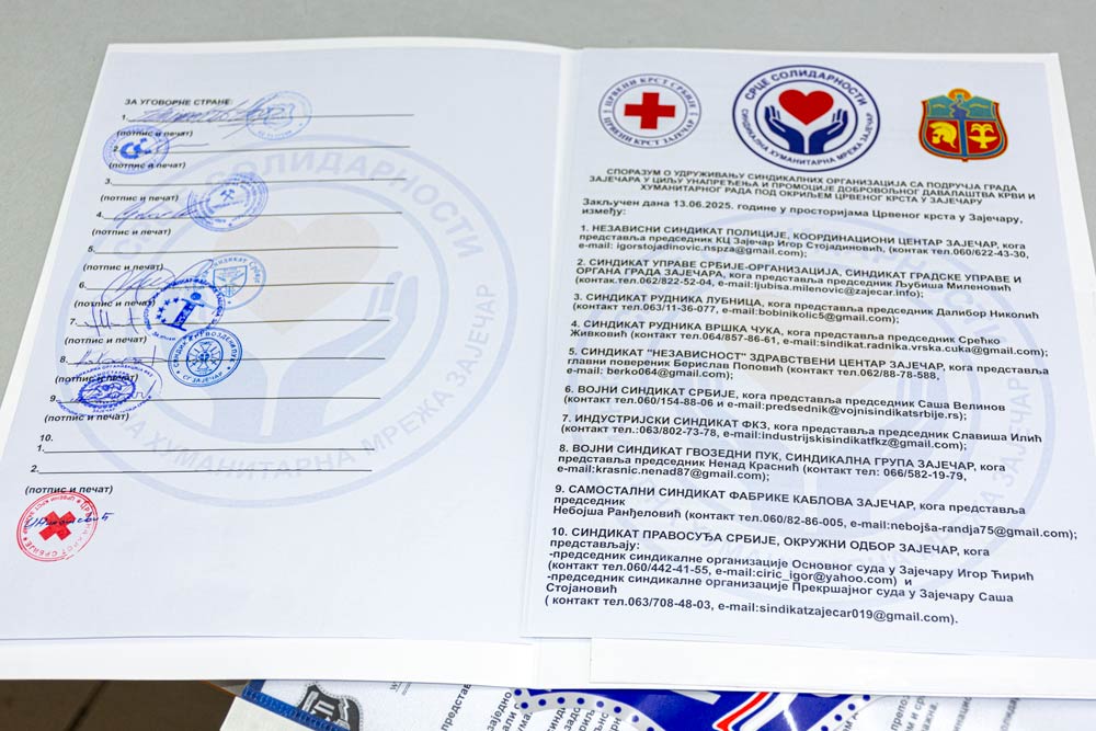 „Posebno želim da naglasim značaj saradnje sa Crvenim krstom Zaječar, koji je godinama unazad pokazivao šta znači biti temelj solidarnosti u našoj sredini. Naš cilj nije samo potpis na papiru, već konkretne akcije: organizovanje dobrovoljnih akcija, pomoć socijalno ugroženima, edukacija i mobilisanje što većeg broja naših članova. Verujem da će ova saradnja doneti rezultate na koje ćemo svi biti ponosni. Zahvaljujem se svim sindikatima koji su prepoznali vrednost ove inicijative, kao i svima koji će svojim radom, vremenom i srcem doprineti da ova humanitarna mreža bude živa, aktivna i snažna“.