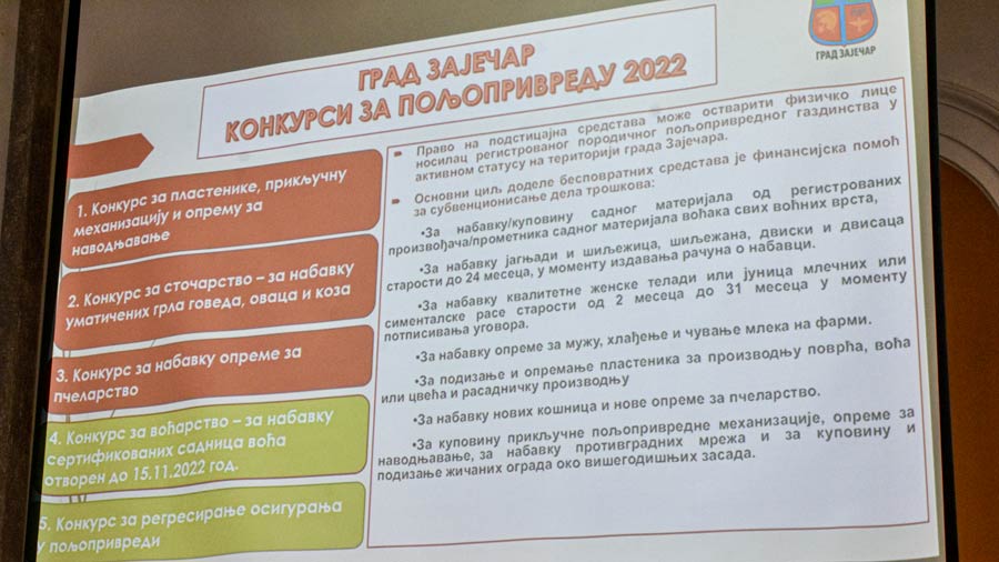 „Osnovni uslovi za prijavu na ova dva konkursa bili su da korisnik sredstava ima registrovano poljoprivredno gazdinstvo u aktivnom statusu na teritoriji grada Zaječara i da se investicija realizuje na teritoriji Zaječara. To su osnovni uslovi, a svaki konkurs je imao i neke dodatne uslove“, istakla je Vensa Stanković, gradska većnica.