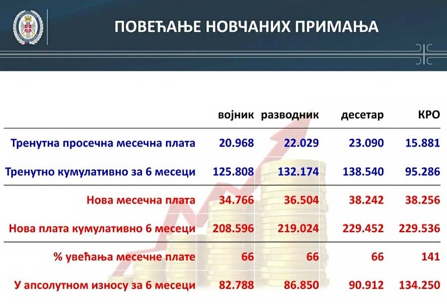 – Povećali smo i plate. Na dobrovoljnom služenju vojnog roka prosek plate do sada je bio 20.968 dinara za vojnika, 22.000 za razvodnika i 23.000 za desetara. Polaznici Škole rezervnih oficira su imali oko 15.881 dinara prosečno. Nova mesečna plata biće 34.766 dinara za vojnika, 36.504 dinara za razvodnika, 38.000 za desetara i 38.000 za polaznika škole rezervnih oficira, što je veoma značajno povećanje. To je, dakle, sa 125.000 na 208.000 za provedeni period u vojsci, odnosno 66 odsto povećanje plate za vojnika, odnosno 141 odsto za polaznika škole rezervnih oficira, jer smatramo da je nepravedno da oni koje školujemo za rezervne vojne starešine budu u tom smislu oštećeni – naglasio je ministar.