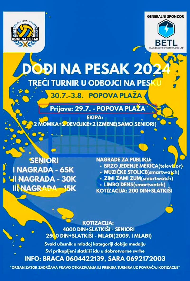 Treći turnir u odbojci na pesku „Dođi na pesak 2024“ biće održan od 30. jula do 3. avgusta na Popovoj plaži u Zaječaru.