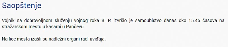 Uviđaj je izvršila Vojna policija, a prisustvovao mu je dežurni zamenik VJT u Pančevu. Prema prvim informacijama, vojnik ima prostrelnu ranu na glavi, a Ministarstvo odbrane je saopštilo da je reč o samoubistvu.