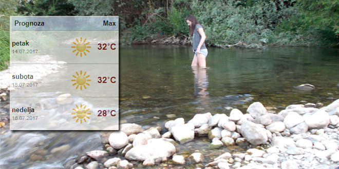 U Zaječaru danas sunčano i toplo. Najviša dnevna temperatura 32 stepena. Prvog dana vikenda, sunčano i toplo, minimalna temperatura 14, najviša dnevna 32 stepena. U nedelju oblačno i svežije, najviša dnevna temperatura 28 stepeni.
