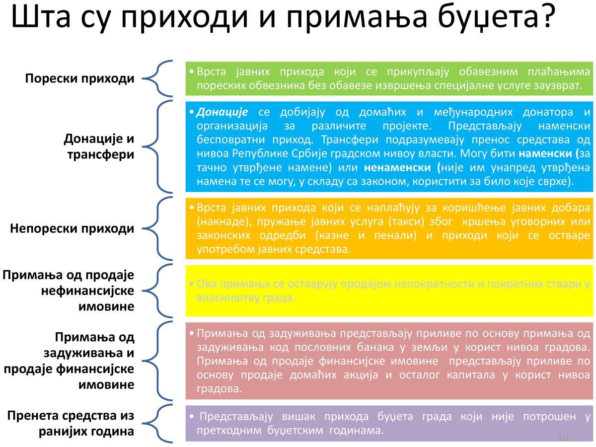 Iz gradskog budžeta se tokom godine plaćaju sve obaveze lokalne samouprave. Isto tako u budžet se slivaju prihodi iz kojih se podmiruju te obaveze.