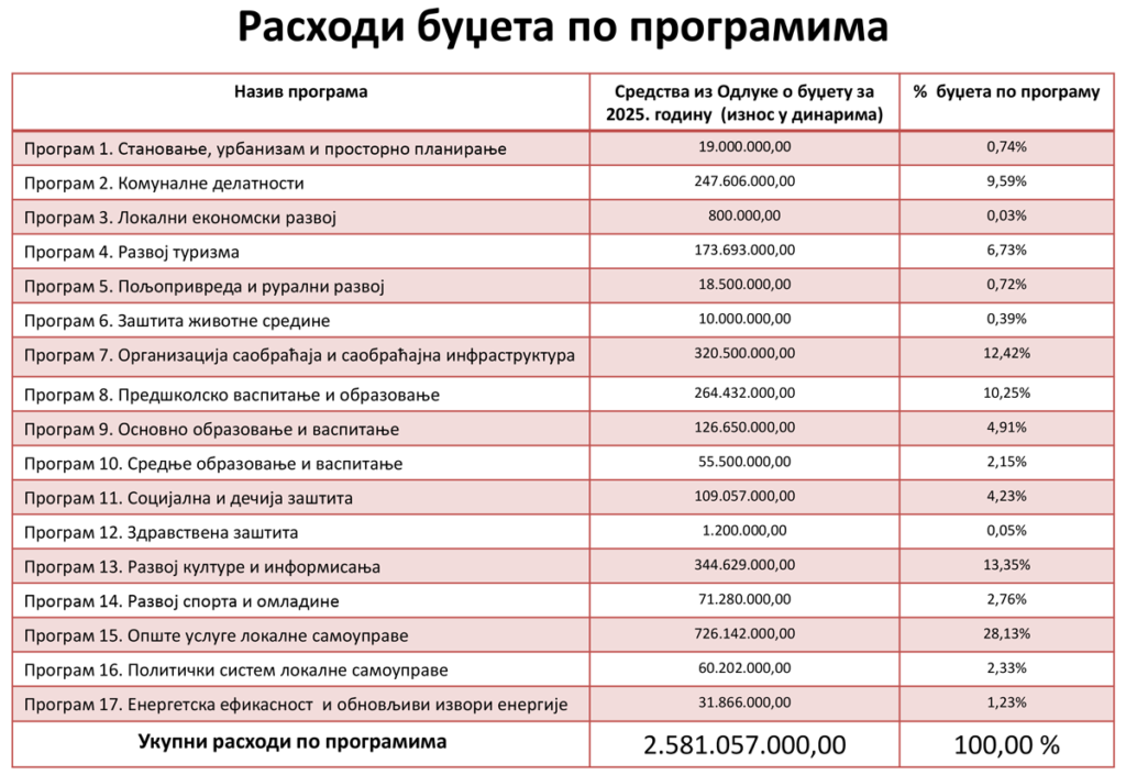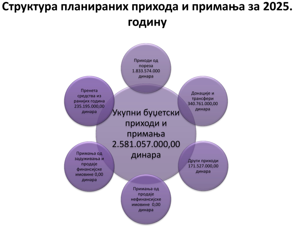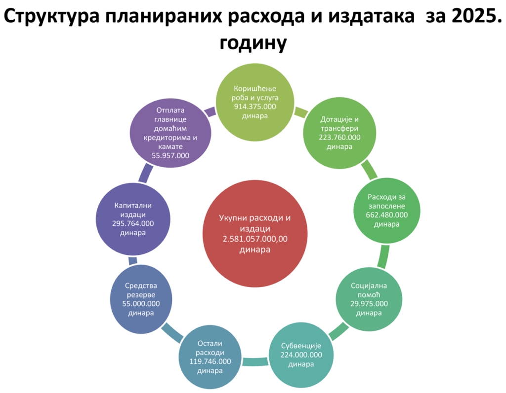 Budžet mora biti u ravnoteži, što znači da rashodi moraju odgovarati prihodima. Ukupni planirani rashodi i izdaci u 2025. godini iz budžeta iznose 2.581.057.000,00 dinara.