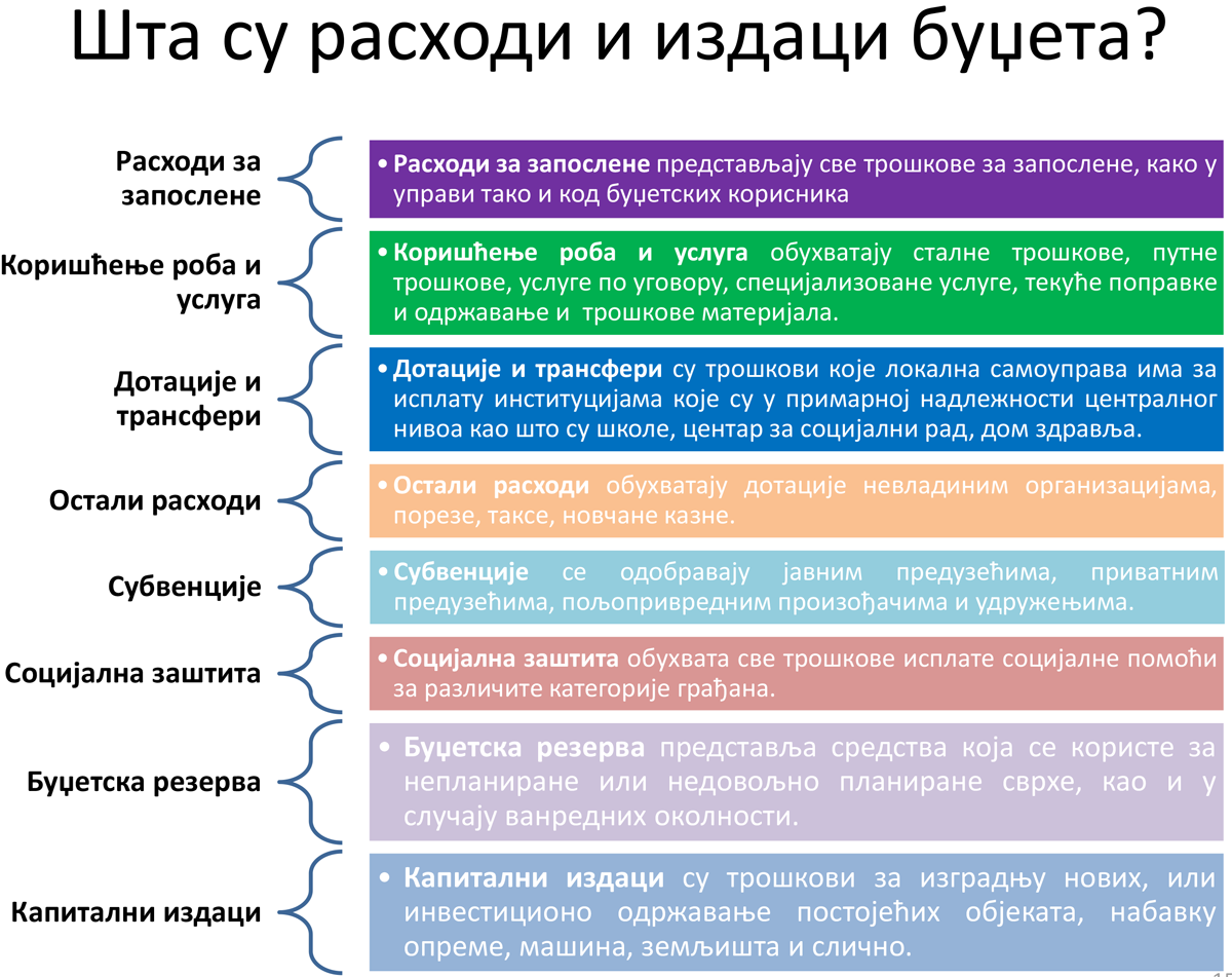 Rashodi predstavljaju sve troškove grada za plate budžetskih korisnika, nabavku roba i usluga, subvencije, dotacije i transfere, socijalnu pomoć i
