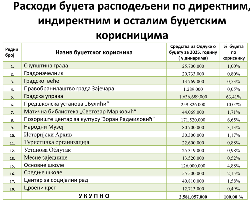 Ukupni javni prihodi i primanja grada Zaječara za 2025. godinu iznose 2.581.057.000,00 dinara.