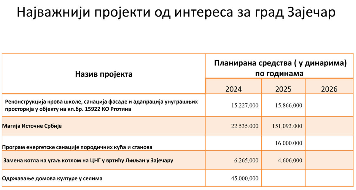 Među najvažnijim projektima od interesa za grad Zaječar planiranim za 2025. godinu je rekonstrukcija krova škole, sanacija fasade i adaptacija unutrašnjih prostorija u objektu u Rgotini, za koji je planirano 15.86 miliona dinara. Za program energetske sanacije porodičnih kuća i stanova u planu je izdvajanje 16 miliona dinara, za zamenu kotla na ugalj kotlom na CNG u vrtiću Ljiljan u Zaječaru u 2025. godini biće izdvojeno 4.6 miliona, dok je za projekat Magija istočne Srbije u planu izdvajanje 151.09 miliona dinara.