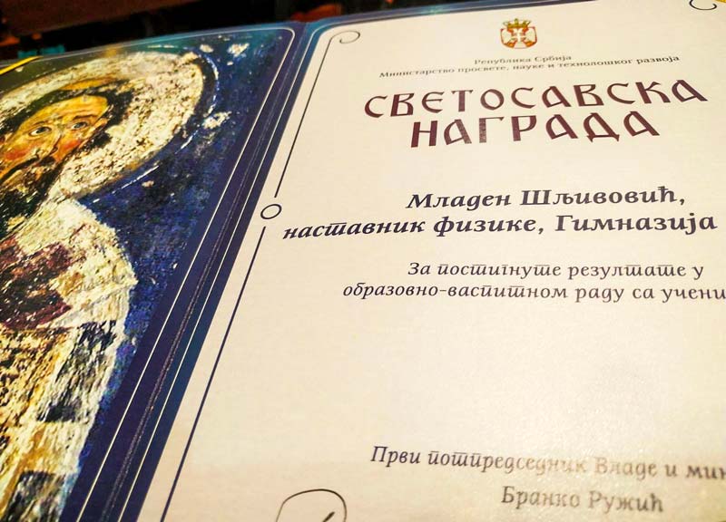 Mladen Šljivović, nastavnik fizike u zaječarskoj Gimnaziji, dobitnik je Svetosavske nagrade za ostvarene izuzetne rezultate u obrazovno-vaspitnom radu sa učenicima.