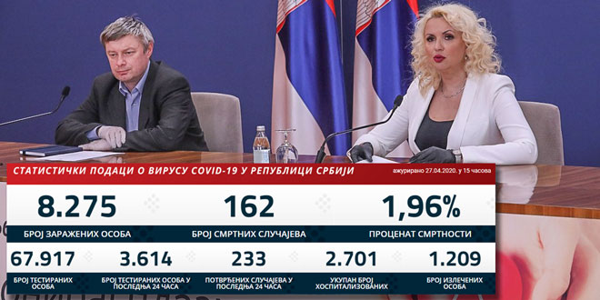 U Srbiji je od koronavirusa u protekla 24 sata preminulo još šest osoba, tri žene i tri muškarca, dok je novozaraženih 233.