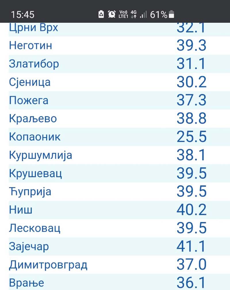 Od početka godine, u Srbiji je danas najtopliji dan, a rekordna temperatura od 40 stepeni u 15 sati zabeležena u pet gradova – Zaječaru, Negotinu, Velikom Gradištu, Ćupriji i Nišu, objavljeno je na sajtu Republičkog hidrometeorološkog zavoda. Već u 15.30 u Zaječaru je izmeren 41,1 stepen.