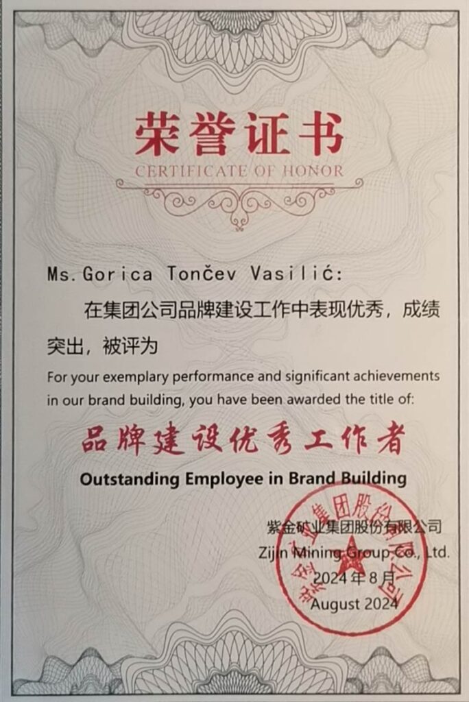 Matična korporacija u Kini dodelila joj je nagradu i titulu „izvanredna u građenju brenda“ zbog toga što je, kako je navedeno, inicirala otvaranje naloga Srbija Ziđin Koper na društvenim mrežama Srbija koji su za manje od dve godine postali primer uspešnog upravljanja društvenim mrežama među srpskim kompanijama.