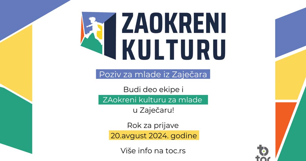 Mlada si osoba iz Zaječara? Zanimaju te kultura i kulturna dešavanja u gradu? Želiš da znaš kako funkcionišu ustanove kulture u gradu? Želiš da se uključiš u kreiranje kulturne ponude okrenute ka mladima? Želiš da saznaš kako teče proces zagovaranja, ali i pisanje praktičnih predloga programa? Timočki omladinski centar – TOC iz Zaječara u okviru projekta ,,ZAokreni kulturu’’ želi da radi na stvaranju veće dostupnosti kulturnog sadržaja za mlade kroz unapređenje angažovanja mladih u kreiranju kulturne ponude prilagođene potrebama i interesovanjima mladih u Zaječaru.