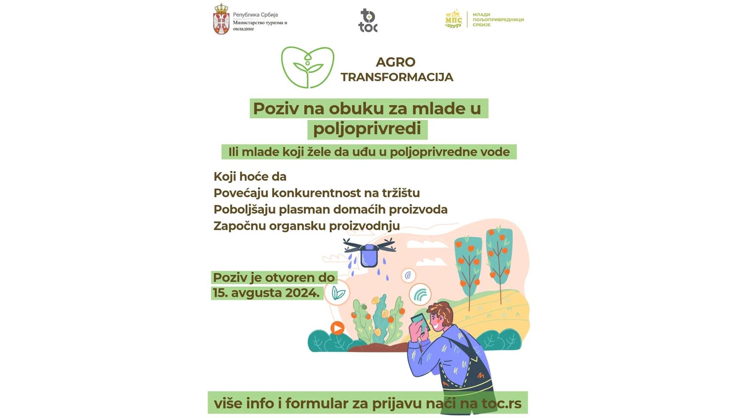 TOC je pozvao sve mlade iz gradova i opština Zaječarskog, Borskog ili Pomoravskog okruga, zainteresovane za poljoprivrednu, organsku proizvodnju, plasman postojećih proizvoda, digitalni marketing, dizajn/osmišljavanje novih proizvoda, da se prijave za učešće na edukacijama koje će organizovati u okviru projekta “Agro transformacija – Mladi poljoprivrednici na putu održive transformacije”.